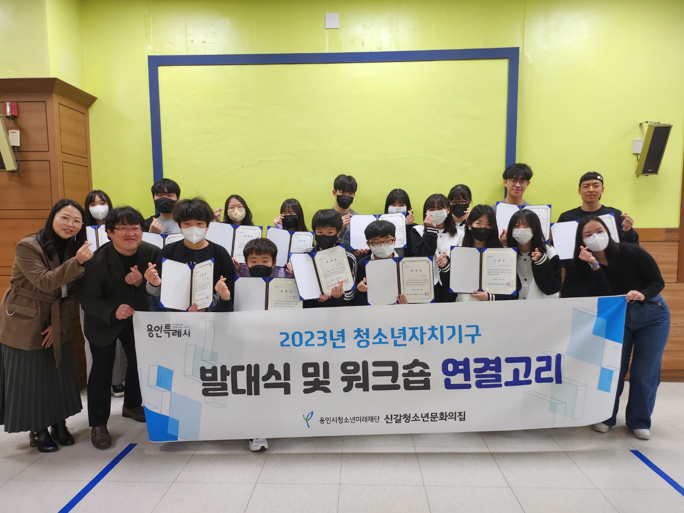 용인시청소년미래재단(이사장 이상일) 신갈청소년문화의집에서는 지난 18일 청소년의 자치활동을 알리는 청소년자치기구 연합 발대식을 개최 하였다. 청소년운영위원회에 위촉장을 청소년동아리에 인준서를 수여하고 앞으로 자치활동의 도움이 되는 역량강화 교육과 팀빌딩 활동을 함께 진행했다.