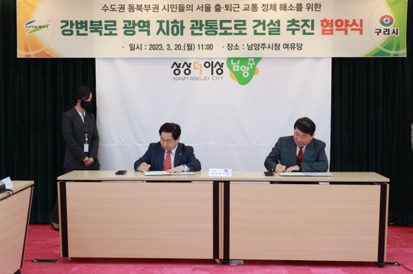 [금요저널] 남양주시는 20일 시청 여유당에서 구리시와 ‘강변북로 광역 지하 관통 도로 건설 추진’을 위한 업무 협약을 체결했다.