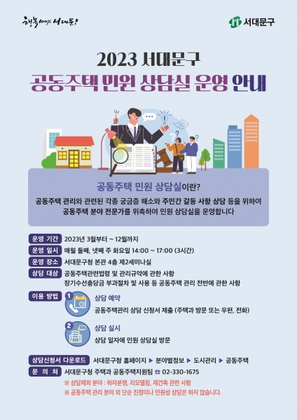 이성헌 서대문구청장은 “투명하고 올바른 공동주택관리 문화 정착을 위해 입주민 간 갈등을 비용 부담 없이 조기 해결하고자 민원 상담실을 운영한다”고 밝혔다.