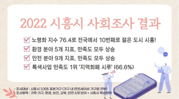‘2022 시흥시 사회조사 보고서’의 자세한 내용은 시흥시청 누리집에 접속해 열린행정-시흥통계-사회조사보고서를 통해 누구나 열람할 수 있다.