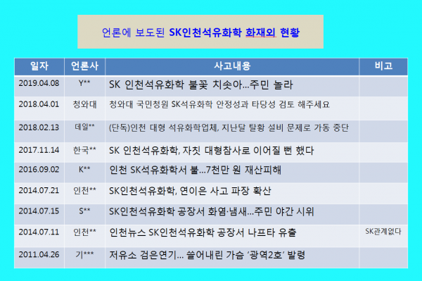 또 김 회장은 “SK인천석유화학에는 여러 차례 크고 작은 사고가 발생했다”며 안정성이 담보되지 않은 13,000평 수소공장은 절대 허가될 수 없다는 주민 입장을 서구청에 전달했지만, 서구청은 이런 지역주민과 환경, 시민단체 의견은 안중에도 없이 허가를 내줬다며 서구청의 막가파식 행정을 규탄하고 국내 재계 2위 SK는 지역주민의 안전과 재산을 어떻게 보호할 것인지에 대해서 그동안 어떤 행동을 취했는지 궁금하다고 지적했다.