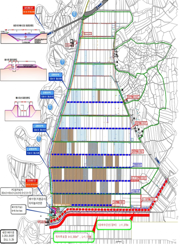 내천2지구 배수개선사업은 추정 총사업비 157억원으로 배수장 1개소 및 배수로 3.3km를 정비하는 사업이며 상습적으로 침수가 발생하는 저지대 논과 밭 등 농경지에 배수를 원활히 해 침수피해를 사전에 방지하고 영농환경을 개선하는 것이 목표다.