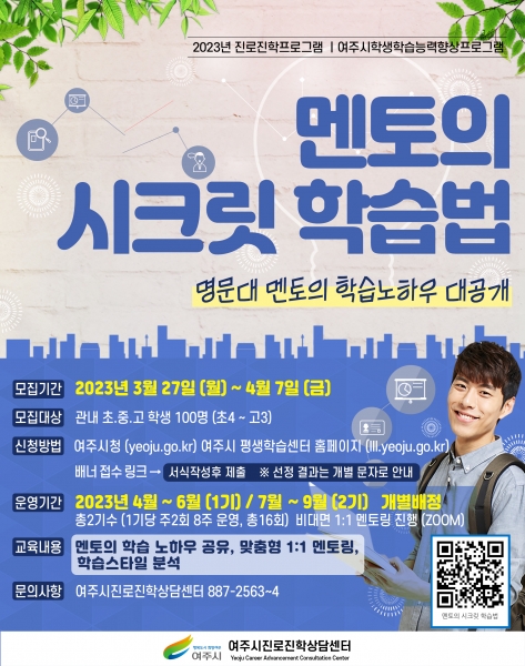 [금요저널] 여주시 진로진학상담센터는 학생 개별 맞춤식 멘토링을 통해 자기주도 학습 방법 습득 및 진로설계 능력 향상을 위한 진로진학프로그램 ‘멘토의 시크릿 학습법’을 관내 초중고 학생을 대상으로 4월부터 9월까지 운영한다.