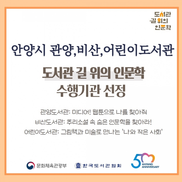 [금요저널] 안양시는 관양, 비산, 어린이도서관 등 산하 도서관 3곳이 ‘도서관 길 위의 인문학’ 수행기관에 선정됐다고 24일 밝혔다.
