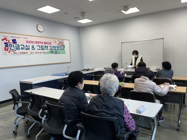 [금요저널] 평택시는 도시취약지역 생활여건 개조사업의 하나로 진행 중인 서정동 새뜰마을 민관협력형 주민돌봄센터를 통해 지역주민들의 삶의 질 향상을 위한 어르신 한글교실 및 그림책 감정코칭 프로그램 등 맞춤형 돌봄사업을 추진한다고 밝혔다.