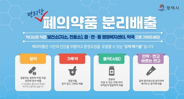 [금요저널] 평택시는 가정 내 폐의약품을 하수구로 흘려버리거나 일반쓰레기와 함께 버릴 경우 토양·수질오염으로 인체에 직접적인 영향을 주기 때문에 올바른 폐기 방법을 지켜줄 것을 당부했다.