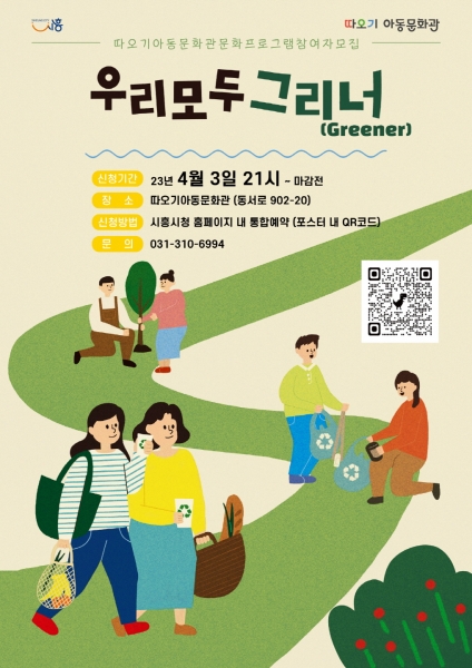 [금요저널] 시흥시가 오는 4월 8일부터 6월 17일까지 따오기아동문화관에서 진행될 아동문화 프로그램 ‘우리 모두 그리너’에 참가할 시민 약 285명을 4월 3일 19시부터 선착순으로 모집한다.