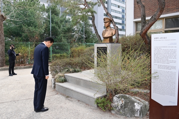 故 윤영하 소령 흉상 앞에서 추모의 시간을 가진 이재호 구청장은 이후 현장 맞춤형 교육정책 수립을 위해 연수구의 사학 명문 송도고등학교 학교관계자와 학부모와의 간담회를 진행했다.