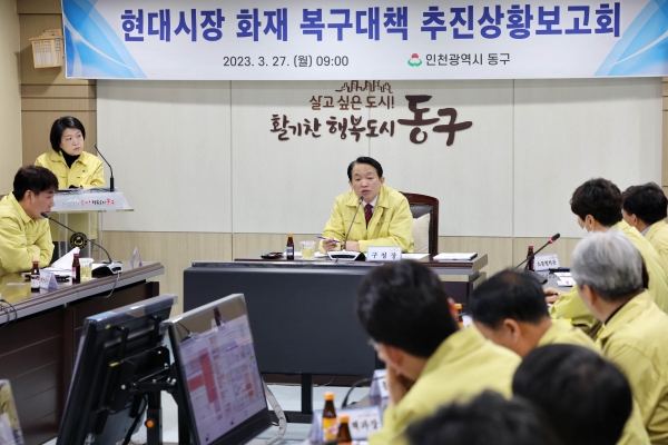 [금요저널] 인천 동구는 27일 구청 철쭉홀에서 현대시장 화재 복구대책 추진상황 보고회를 개최했다.