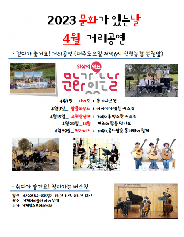 [금요저널] 거제시는 4월 1일부터 매주 토요일마다 고현동 신현농협 앞 본점 앞에서 문화가 있는 날 거리공연 행사를 개최한다.