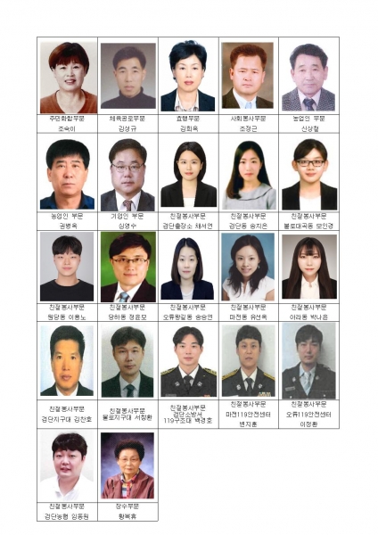 부문별 수상자로는 주민화합 부문 조숙이 씨, 체육공로 부문 김성규 씨, 효행 부문 김희옥 씨, 사회봉사 부문 조정근 씨, 농업인 부문 신상철, 권병옥 씨, 기업인 부문 심영수 씨, 친절봉사 부문 채서연, 송지은, 모인경, 이용노, 정윤모, 송승연, 유선옥, 박나윤, ·김찬호, 서창환, 백경호, 변지훈, 이정환, 임동원 씨가 장수부문에는 황복휴 씨 등이다.