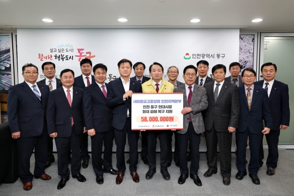 인천광역시 새마을금고는 지난 27일 동구를 방문, 현대시장 화재 피해 복구를 위한 성금 5,800만원을 전달했다.