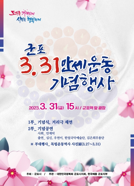 [금요저널] ‘도시를 가치있게, 시민을 행복하게’를 구현 중인 군포시가 오는 31일 오후 3시부터 군포역 앞 항일독립만세운동 기념탑 일대에서 104주년 ‘군포 3.31 만세운동 기념행사’를 개최한다고 밝혔다.