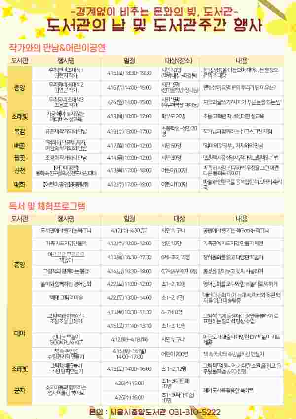이번 시흥시중앙도서관 도서관주간 행사에 참여를 원하는 시민은 도서관 누리집을 통해 신청할 수 있으며 자세한 내용은 도서관 누리집을 참고하면 된다.