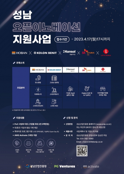 ‘2023 성남 오픈이노베이션’은 성남산업진흥원과 ‘㈜호반건설, 코오롱베니트㈜, 한솔PNS IT서비스부문, SK C&C, ㈜호텔롯데 롯데월드’가 함께 혁신적인 기술력과 아이디어를 창출하는 성남시 창업기업과 협업해 새로운 가치를 만들어 내는 사업이다.