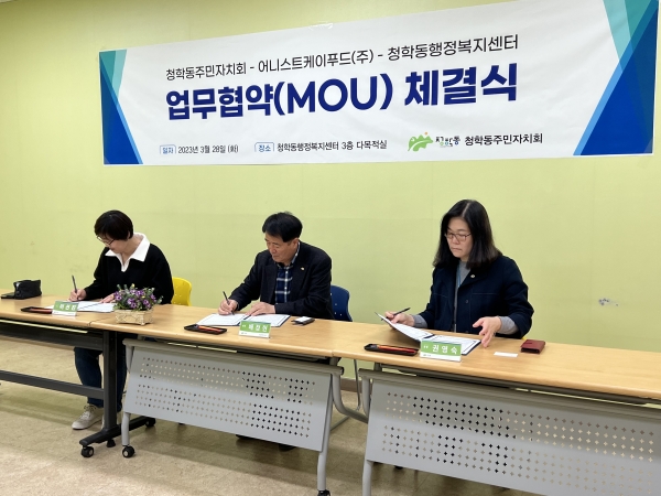 같은 날 청학동에서는 청학동 주민자치회와 동 행정복지센터, 어니스트케이푸드㈜와 저소득 독거세대 반찬 지원사업 ‘딩동, 반찬 왔어요’ 추진을 위한 업무 협약을 체결했다.