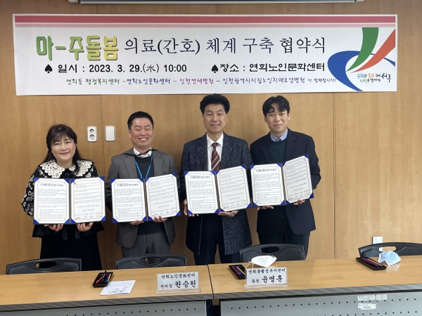 [금요저널] 인천 서구 연희동 행정복지센터가 연희노인문화센터, 인천연세병원, 시립노인치매요양병원과 업무협약을 체결하고 의료·간호 사업을 공동 추진한다고 30일 밝혔다.