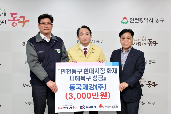 동국제강은 지난 29일 동구를 방문, 현대시장 화재 피해 복구를 위한 성금 3,000만원을 기탁했다.