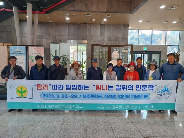 [금요저널] 새마을문고중앙회세종특별자치시지부에서는 읍면동 회장 11명이 3월 28일부터 29일까지 1박2일로 제주 원주민의 발상지인 “삼성혈”을 찾아 탐라의 태동에 대한 역사적 가치를 함께 살펴보며 제주의 독특한 여건에서 파생된 신화와 입에서 입으로 전해진 설화를 근간으로 파생된 구비문학과 해녀들의 호오이 호오이 숨비소리를 담은, 생명줄 바다의 삶을 노래한 바당문학, 제주인의 역사와 문화의 정통성이 내포된 제주어를 매개로 하는 제주어 문학 등 삼다도의 독특한 제주문학을 만들어 가며 제주의 지속 가능한 미래와 가능성에 대한 성찰을 통해 무한한 문학적 상상력을 보여주고 있는 제주 문학관을 찾아서 “창조와 도전의 미래전략 수도 세종”의 역사와 미래를 담아내고 세종시민의 희로애락을 잘 표출해 낼 수 있는 문학적 가치 창출을 이루어 낼 수 있는 계기를 마련해보았으며 특히 세종시새마을의 지역가꾸기 봉사현장에서 새마을지도자의 한사람으로써 선각자적 역할을 되새겨 본다는 생각으로 김만덕 기념관을 찾아 나눔과 봉사정신을 계승해 은혜의 빛이 온세상에 퍼질 수 있게끔 세종시의 나눔문화에 이바지 할 수 있도록 하겠다는 각오를 다져 보았다.
