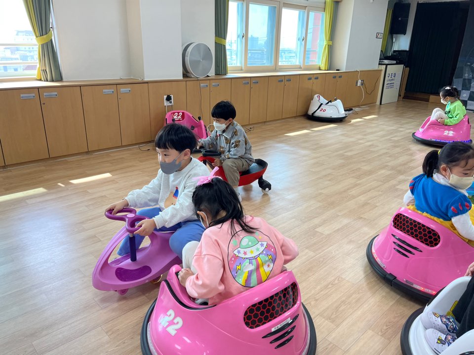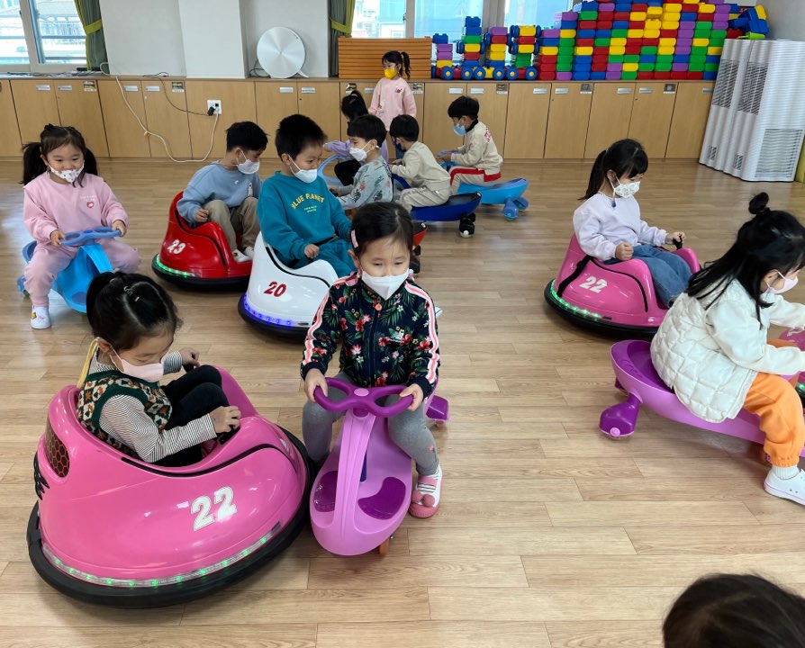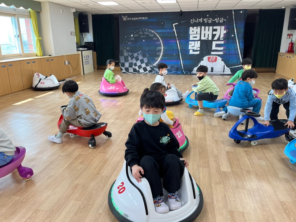 ◈ 키즈카페 놀이기구를 체험하기 전에 놀이기구의 이용 방법 및 안전한 규칙에 대한 설명을 듣는 유아들의 얼굴에서 설렘과 기대감이 느껴졌다. 유아들은 범버카를 타고 안전한 운전을 위해 안전벨트를 맨 후, 앞으로, 옆으로, 뒤로 직접 방향을 조정하면서 강당을 자유롭게 누볐다.