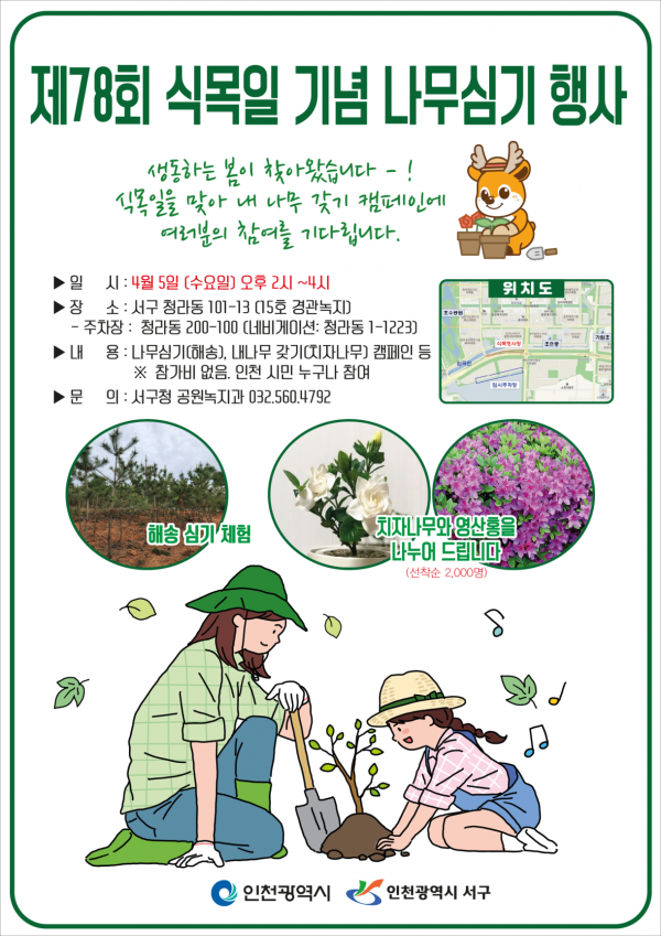 [금요저널] 인천 서구가 5일 청라15호 경관녹지에서 78회 식목일 기념 나무심기 행사를 개최한다고 3일 밝혔다.