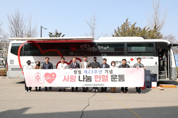 [금요저널] 연천군시설관리공단은 지난달 31일 23번째 창립기념일을 맞아 코로나19 장기화로 인한 혈액 수급난 해소에 동참하고 이웃사랑 생명 나눔을 실천하고자 연천종합운동장에서 사랑의 헌혈 나눔 운동을 추진했다.