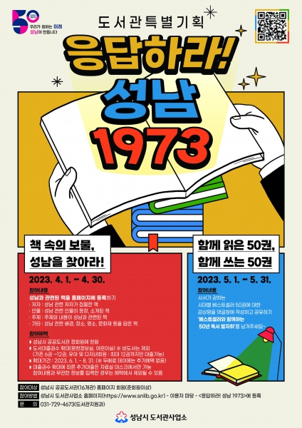 ‘책 속의 보물 성남을 찾아라’, ‘함께 읽은 50권, 함께 쓰는 50권’ 등 2개 행사가 성남시 도서관사업소 홈페이지를 통해 진행된다.