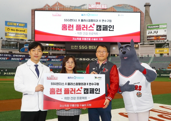 이번 협약은 민관협력을 통해 경제적 어려움을 겪는 저소득층의 건강한 삶을 지원하기 위해 마련된 것으로 인천SSG랜더스필드 내 ‘플러스정형외과 홈런존’ 구역으로 SSG랜더스 소속 선수가 홈런 1개를 기록할 때마다 관절 수술 1건을 적립하게 된다.