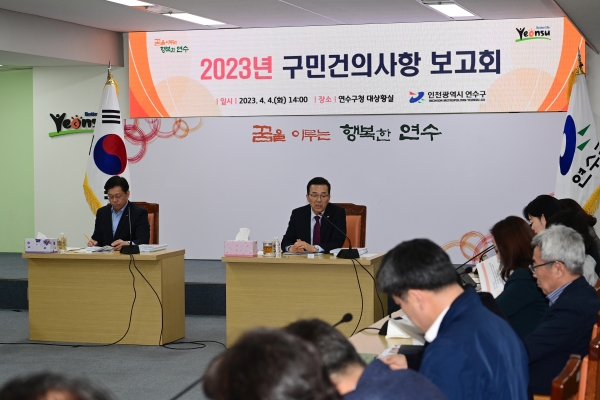 [금요저널] 연수구는 지난 4일 대상황실에서 구청장 주재로 주민 불편 사항 등 해결 방안을 논의하기 위한 2023년 민선8기 구민 건의사항 보고회를 개최했다.