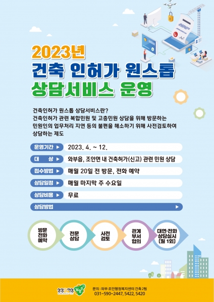 [금요저널] 남양주시 와부조안행정복지센터는 2023년 특화 시책으로 올해 4월부터 12월까지 ‘건축 인허가 원스톱 상담서비스’를 운영한다고 6일 밝혔다.