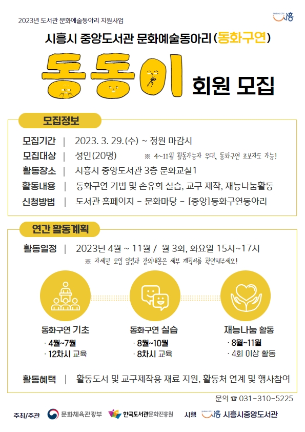 [금요저널] 시흥시중앙도서관은 문화체육관광부가 주최하고 한국도서관문화진흥원이 주관하는 ‘2023년 도서관 문화예술동아리 활동지원’ 사업 시행기관으로 선정돼 오는 11일부터 동화 구연 전문교육과 실습을 진행한다.