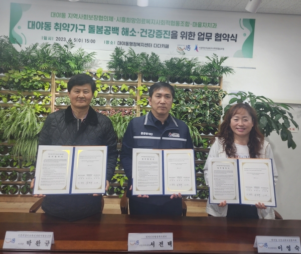 이번 협약을 통해 시흥희망의료복지사회적협동조합과 대야동 맞춤형복지팀, 지역사회보장협의체는 유기적인 업무 협력체계를 구축해 돌봄 공백 해소에 힘을 모은다.