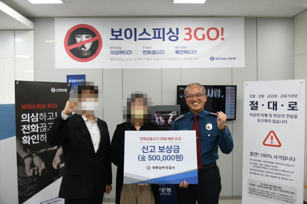 [금요저널] 세종남부경찰서는 전화금융사기 피해를 예방한 신한은행 은행원 A씨에게 표창장을 수여하고 신고보상금을 지급했다고 7일 밝혔다.