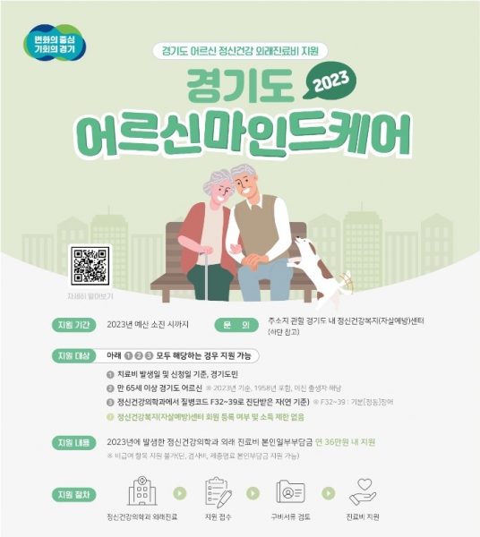 ‘어르신마인드케어’는 노인 정신건강 외래치료비 지원을 통해 정신질환 조기발견 및 조기개입 체계를 마련하고 꾸준히 치료를 이어갈 수 있도록 치료비에 대한 경제적 부담을 완화해 정신질환 만성화 예방 및 자살률 감소를 도모하는 사업이다.