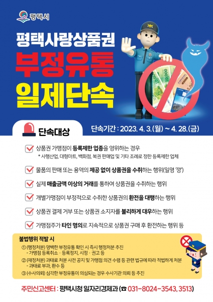 시 관계자는 “평택사랑상품권이 많은 사람의 관심을 받는 만큼 부정 유통 단속을 철저히 해 건전한 유통 질서 확립에 최선을 다하겠다”며 “가맹점주와 시민 여러분들의 적극적인 협조를 부탁드린다”고 말했다.