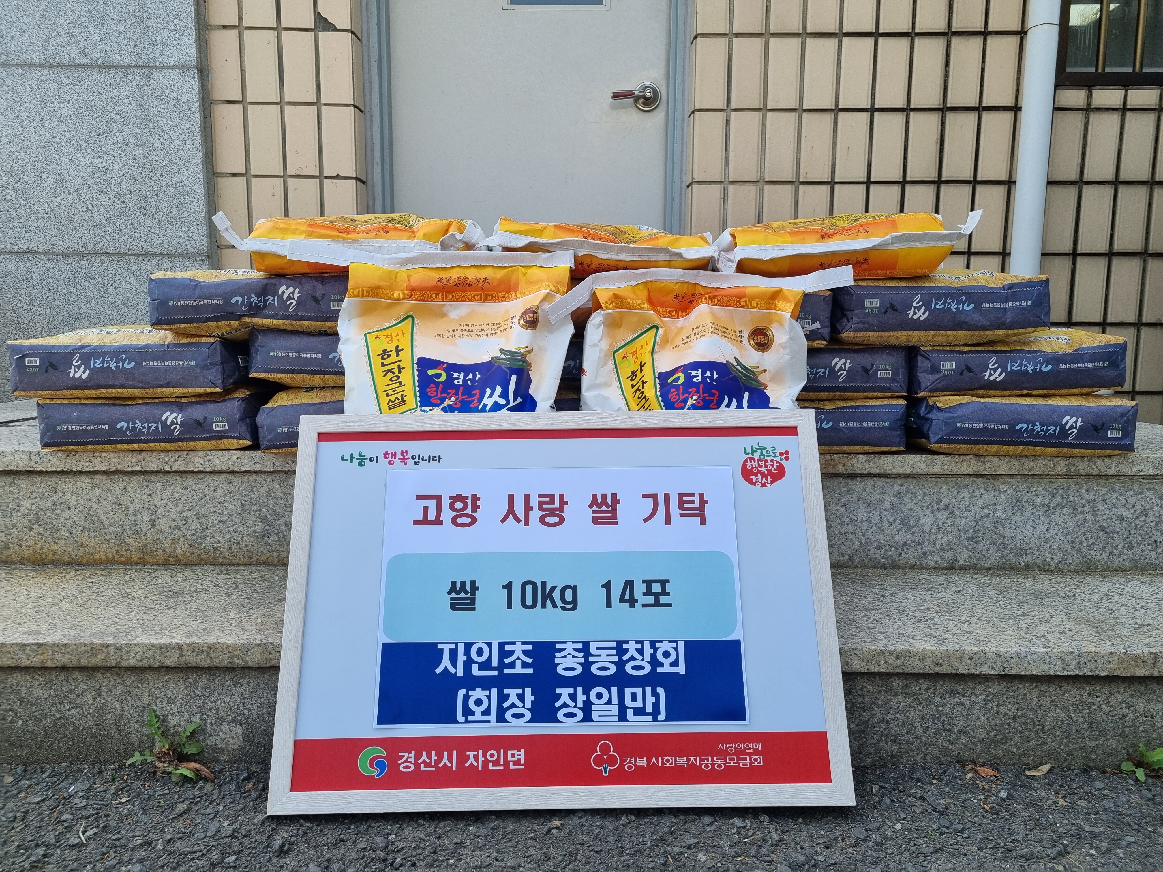 자인초등학교 총동창회(회장 장일만)은 8일 회장 이·취임식을 갖고 축하 화환을 대신해 받은 쌀 10kg 14포를 관내 어려운 이웃에게 전달해 달라며 자인면행정복지센터에 기탁했다.