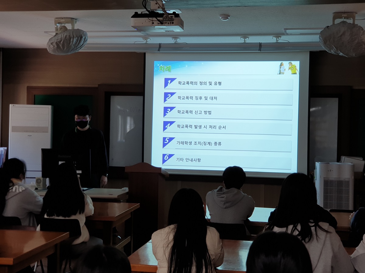교육내용은 학교폭력의 정의와 유형, 학교폭력 징후 및 대처, 학교 폭력 신고 방법, 학교 폭력 발생 시 처리 순서, 가해학생 조치(징계) 종류, 기타 안내사항 등을 교육하였다.