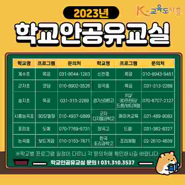 [금요저널] 시흥시는 학교 공간이 학교 밖 시민이나 타 학교 학생들도 풍성한 마을교육 활동을 접할 수 있는 ‘학교 안 공유교실’ 사업을 이달부터 올해 말까지 추진한다.