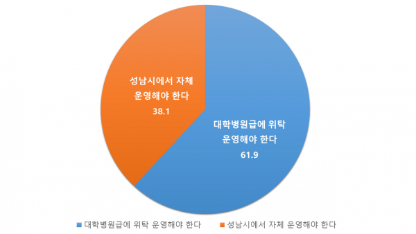 반면 현재와 같이 ‘성남시에서 자체 운영해야 한다’는 의견은 38.1%로 대학병원급 위탁 운영을 선호하는 비율이 압도적으로 높았다.