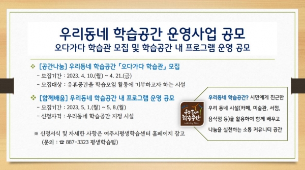 [금요저널] 여주시 평생교육과는 우리동네 학습공간 운영을 위해 ‘2023년 여주시 오다가다 학습관 운영사업’ 공모를 진행한다.