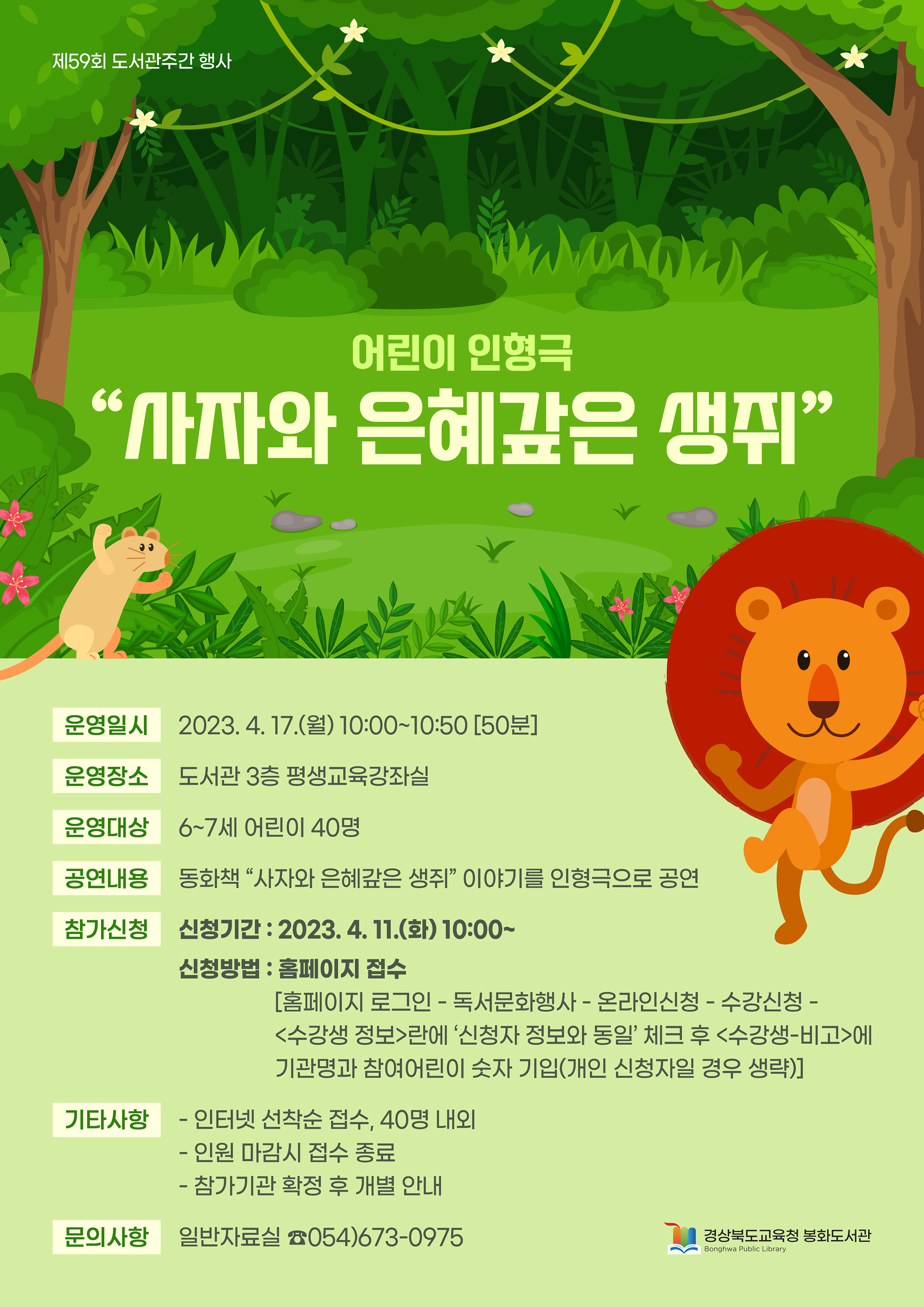 행사와 관련한 사항은 봉화도서관 누리집(www.gbelib.kr/bh)을 참고하거나 일반자료실(054-673-0975)로 문의하면 된다.