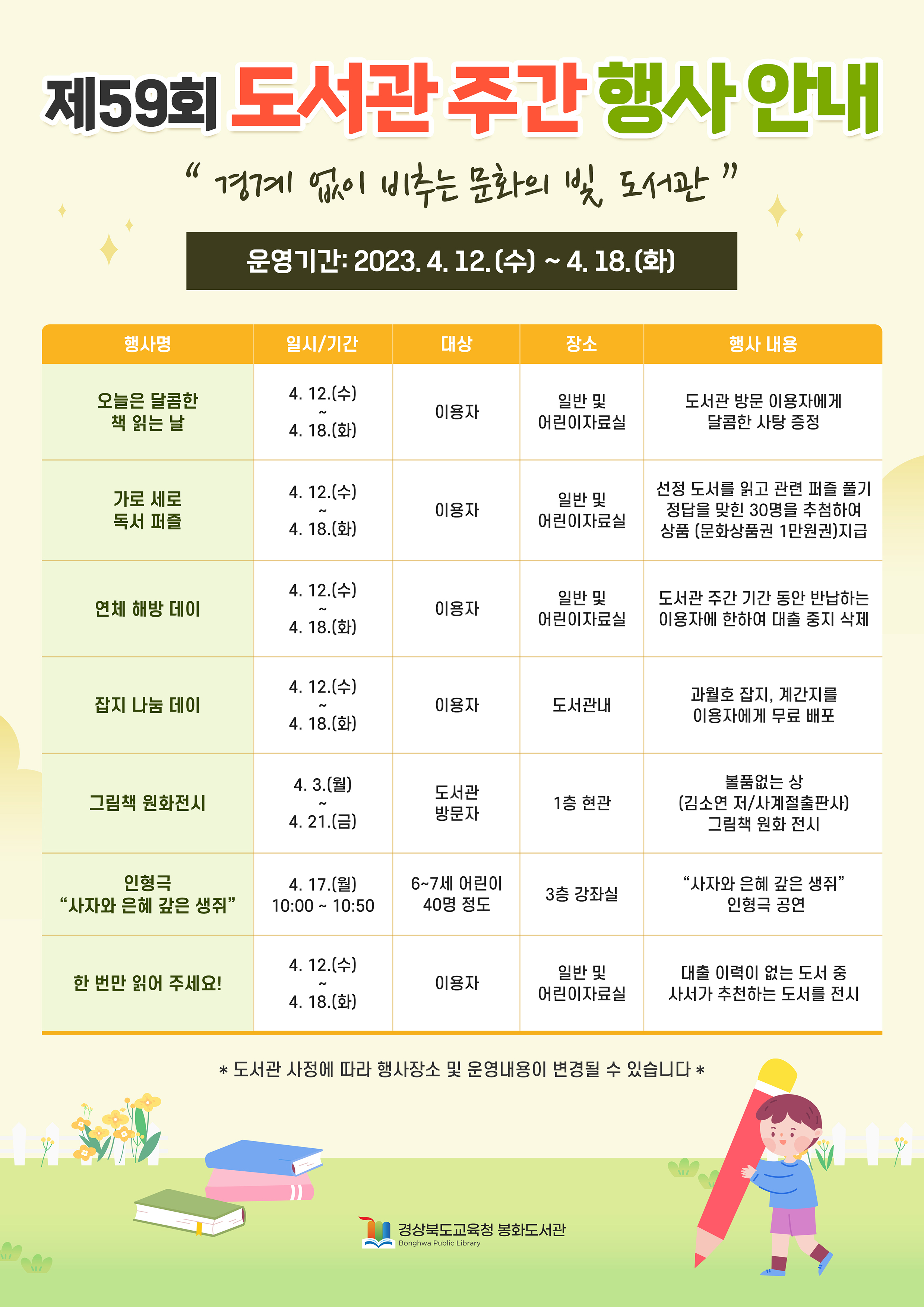 경상북도교육청 봉화도서관은‘경계 없이 비추는 문화의 빛, 도서관’이라는 주제로 오는 4월 12일부터 18일까지 다양한 도서관주간 행사를 운영한다.