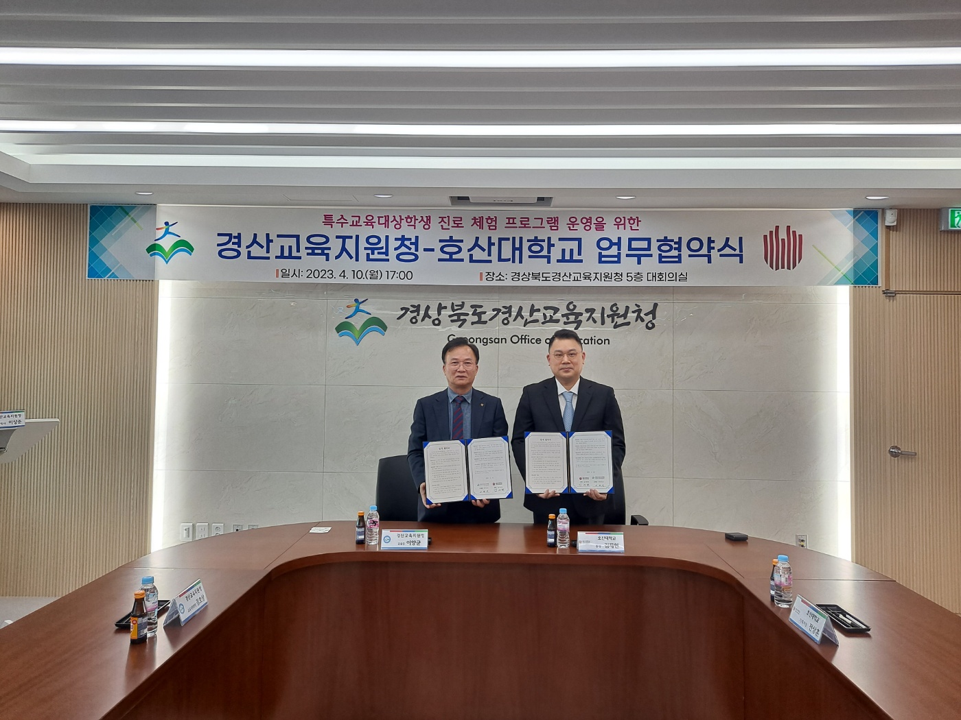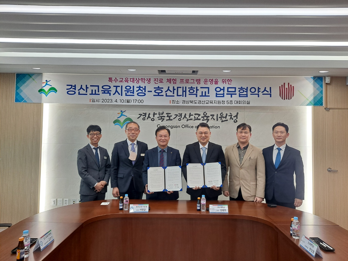 □ 경산교육지원청(교육장 이양균)은 지난 4월 10일 경산교육청 대회의실에서 호산대학교(총장 김재현)와 특수교육대상학생의 진로 체험 프로그램 운영을 위한 업무협약을 체결했다.