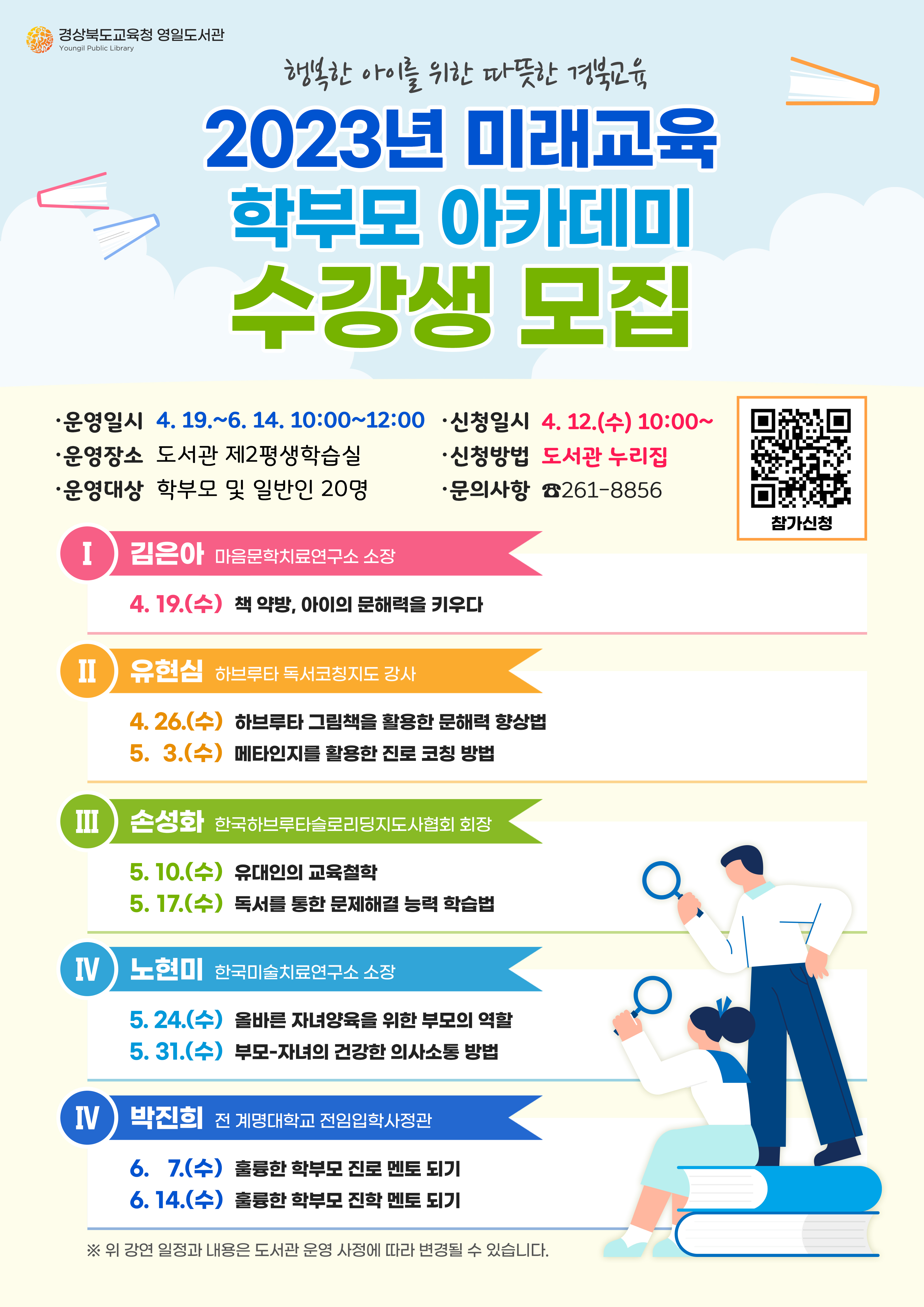 □ 경상북도교육청 영일도서관(관장 이영분)은 4월 19일부터 6월 14일 까지 매주 수요일 오전 10시 도서관 제2평생학습실에서 학부모 및 일반인을 대상으로 「2023년 미래교육 학부모 아카데미」를 운영한다.