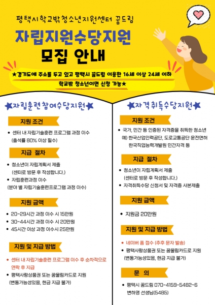 학교 밖 청소년의 자립 지원 수당 신청은 연중 가능하며 관련 문의는 평택시 학교밖청소년지원센터 꿈드림으로 연락하면 자세한 안내를 받을 수 있다.
