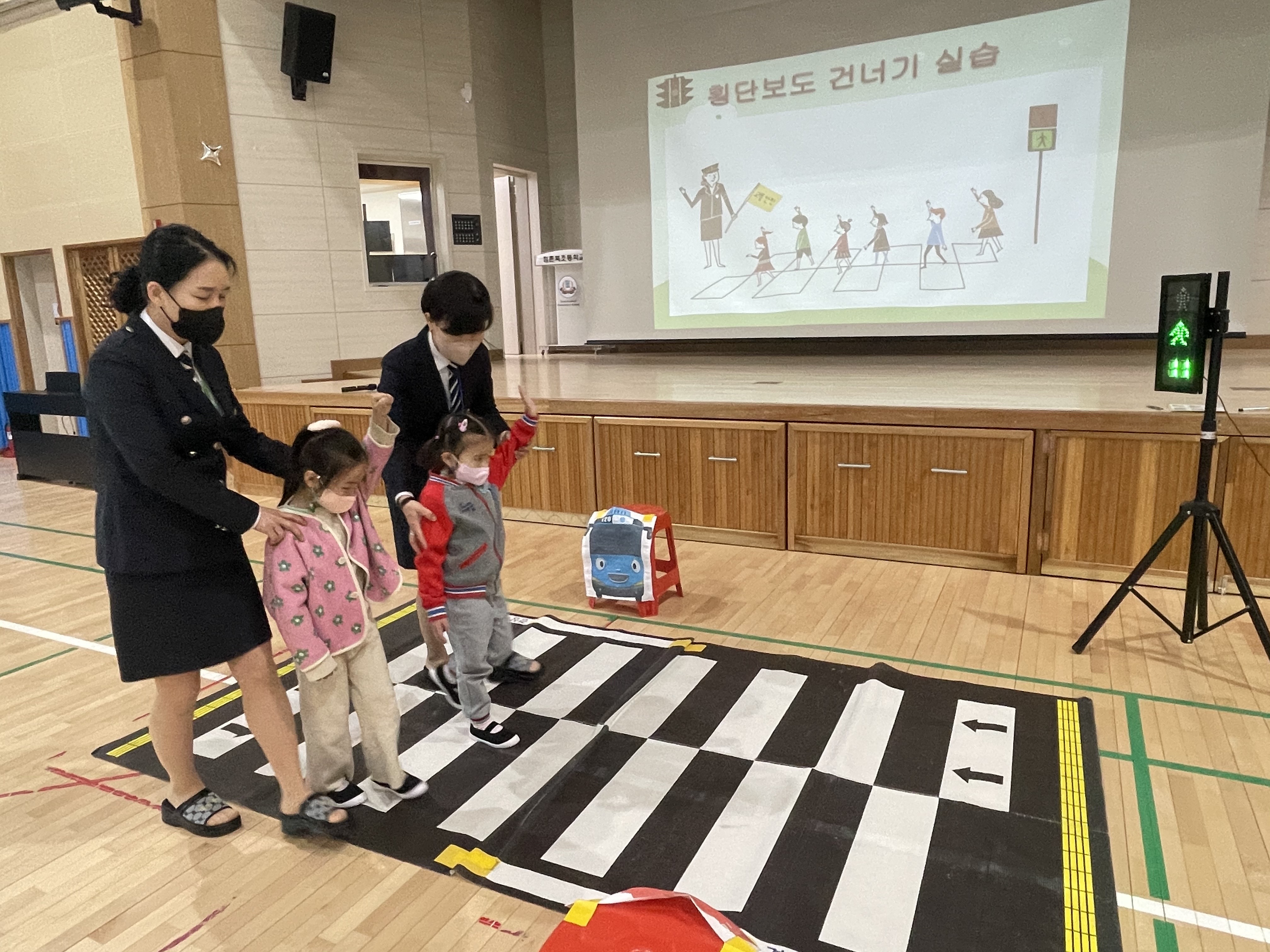 □ 이번 교통안전 교육은 유아들이 실생활에 바로 적용할 수 있도록 가상의 횡단보도를 만들어 유아가 직접 건너보는 체험형으로 구성되어 더욱 흥미있게 배울 수 있도록 구성되었다.
