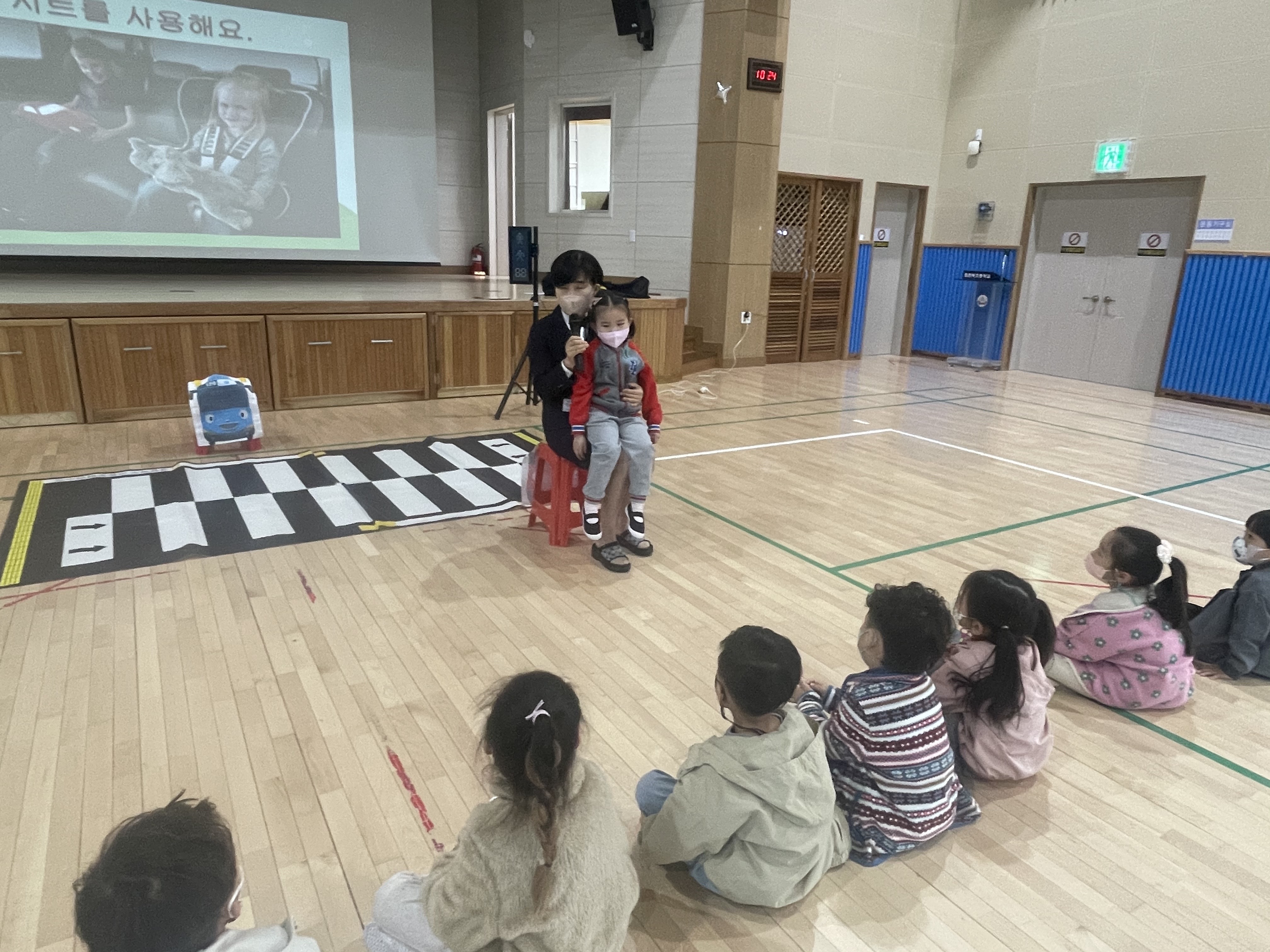 □ 교통안전과 관련된 PPT를 보면서 차량 안전 수칙과 신호등, 횡단보도 건너는 방법 등에 관한 이야기를 나눈 후, 차 안에서 지켜야 할 예절과 타고 내릴 때의 안전경험에 관한 이야기도 주고 받으며 교통안전 교육을 실시하였다.