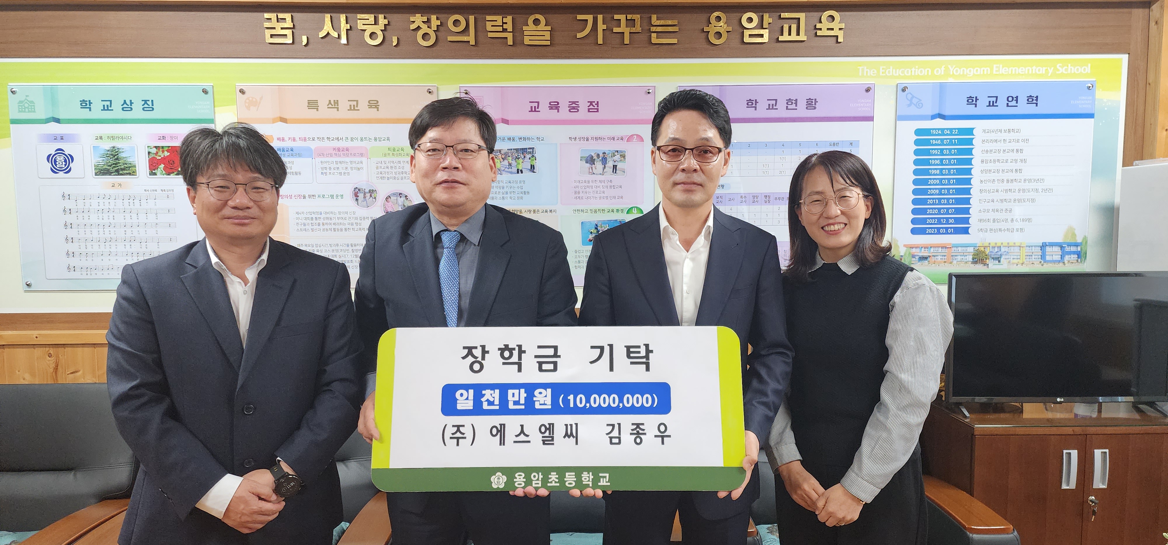 ㈜ 에스엘씨 대표 김종우님께서 4월 11일(화) 용암초등학교를 방문하여 장학금 1000만원을 기탁하여 주셨다. 김종우 대표님께서는 용암초등학교 제56회 졸업생으로 지역사회의 기부 일환으로 모교를 직접 방문하여 장학금을 전달하였다.