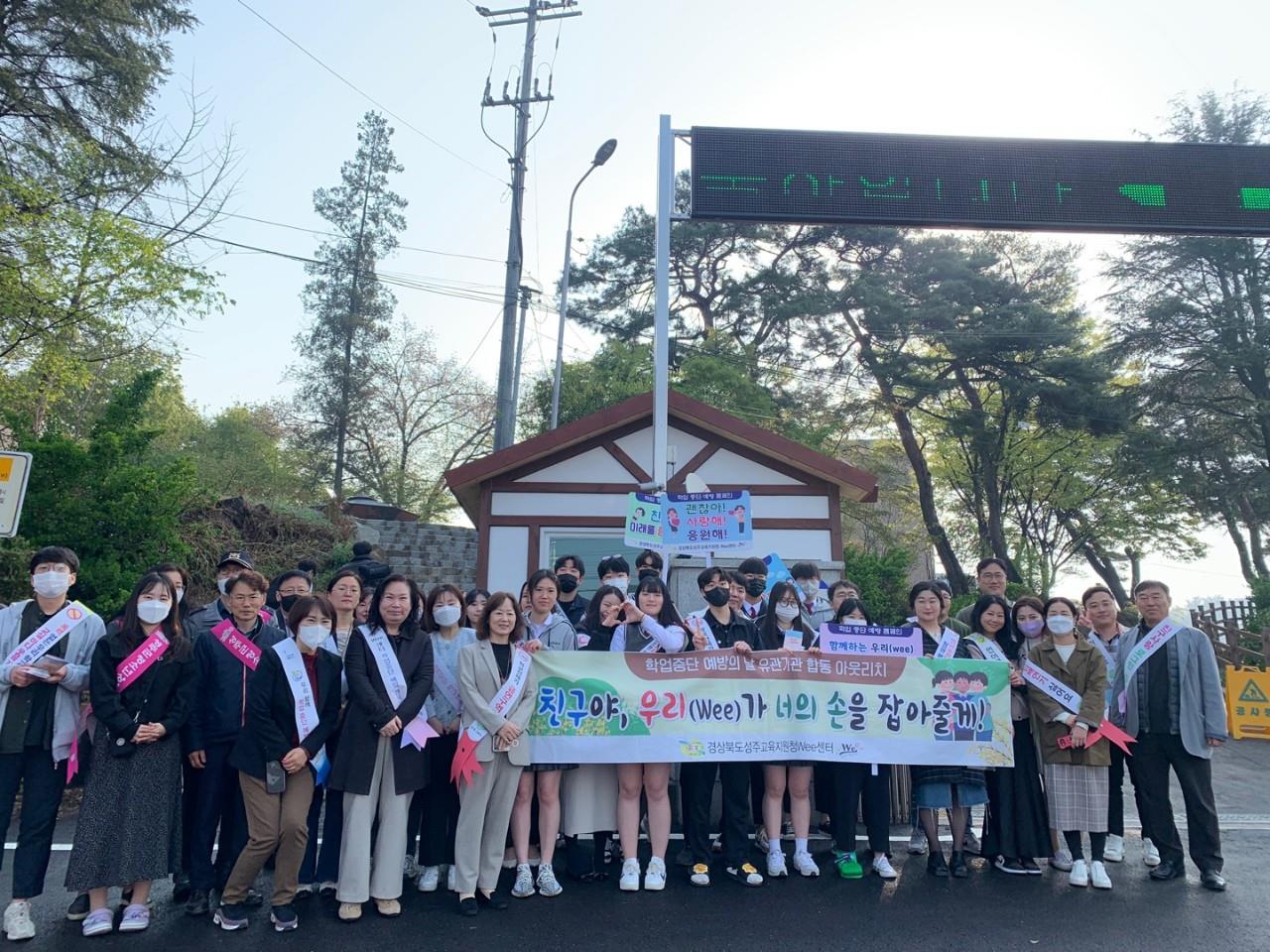 □ 이날 캠페인에는 성주Wee센터의 안지은장학사, 전문상담교사, 성주청소년상담복지센터, 학교전담경찰관, 명인중,고등학교 전교직원이 참여하여 학업중단예방 인식 고취는 물론 학교 밖 청소년들의 학업 복귀 지원 활동을 강화하고자 하였다.