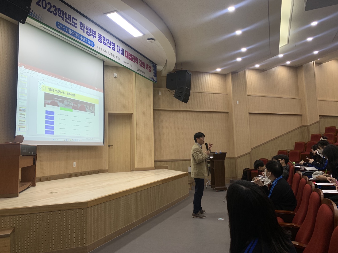 □ 대전진학지도협의회 교육정책 국장을 맡고 있는 대전 동방고 최철규 교사를 강사로 초청하여 대입 전략 특강을 실시하였다. 학생부 종합전형을 비롯한 대입전형의 이해와 전략적인 대입 지원, 학교생활기록부 관리 방법 등을 설명하고 구체적으로 대입 로드맵을 설계하는 절차에 대해 알아보는 시간을 가졌다.
